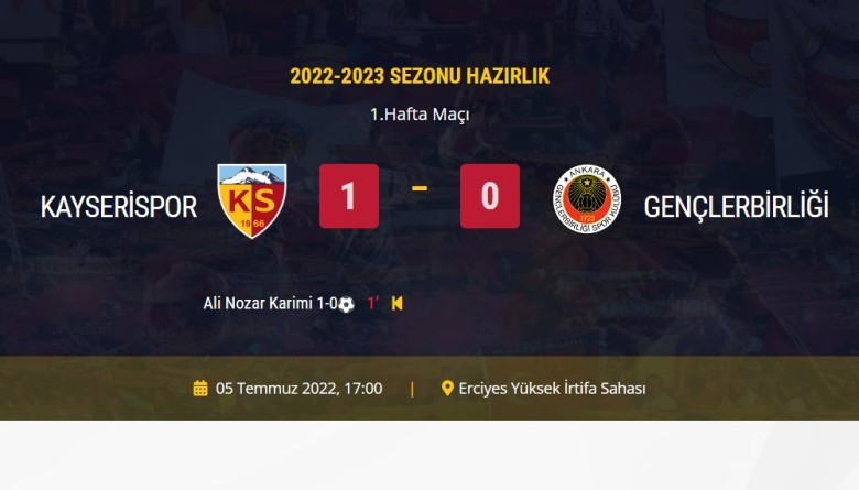 Kayserispor, Sezonun ilk hazırlık maçını gizli saklı yaptı. Basına ve taraftardan kapalı yapılan maçı Kayserispor, Ali Nozar Karimi attı gol ile Gençlerbirliği'ni 1-0 mağlup etti. Bir çok oyuncu değişikliği yapıldı.
