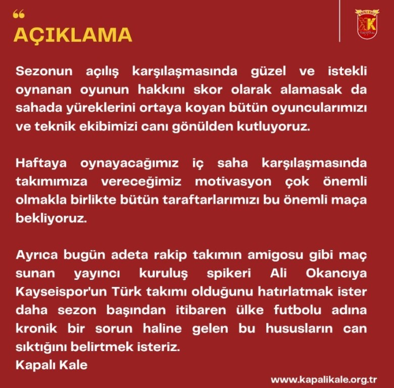 Genel Kapalı Kale Derneğinden Kayserispor'a Destek ve Maçın Spikerine Tepki. 3 yıl önce oluşturuldu. — 1 saniye önce güncellendi Kayserispor Kapalı Kale Derneği'nden Kayserispor'un oynadığı futbola destek gelirken. Taraflı maç anlatımı nedeni ile basın açıklaması geldi. https://twitter.com/KapaliKale/status/1556040520086036482 Beşiktaş Kapalı Kale Bu İçeriğe Tepki Ver (en fazla 3 tepki) 0 Beğendim 0 Beğenmedim Facebook Yorumları