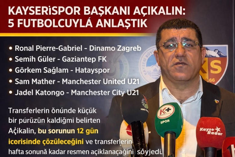 Başkan Açıkalın, 5 futbolcuyla prensip anlaşmasına varıldığını ve imzaların atıldığını kamuoyuyla paylaşırken, transferlerin önünde yalnızca küçük bir pürüzün kaldığını ifade etti. Transfer tahtasıyla ilgili bu sorunun 1-2 gün içerisinde çözüleceğini belirten Açıkalın, hafta sonuna kadar transferlerin resmen açıklanacağını da sözlerine ekledi.