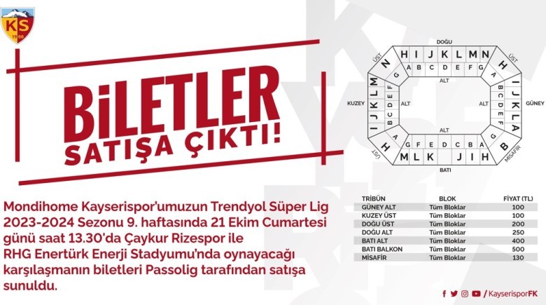 Mondihome Kayserispor’umuzun Trendyol Süper Lig 2023-2024 Sezonu 9. haftasında 21 Ekim Cumartesi günü saat 13.30'da Çaykur Rizespor ile RHG Enertürk Enerji Stadyumu’nda oynayacağı karşılaşmanın biletleri Passolig tarafından satışa sunuldu.