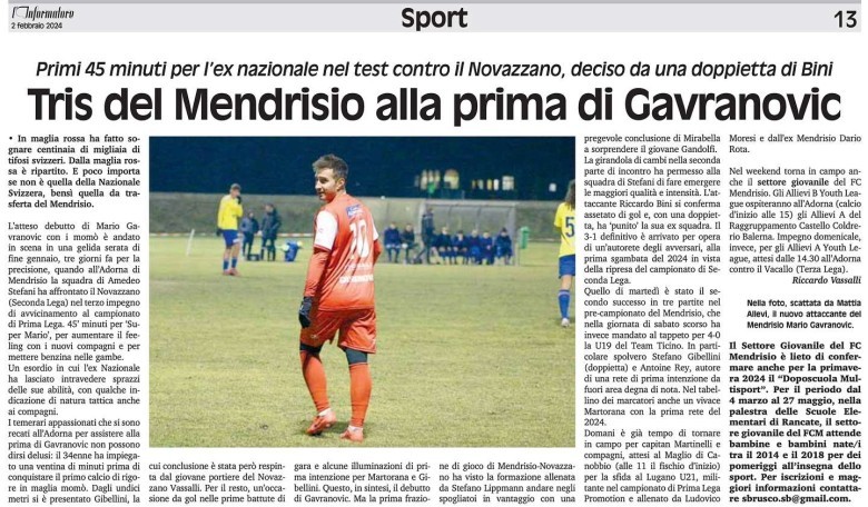 Mario Gavranoviç İsviçre 4. lig takımlarından FC Mendrisio takımına transfer oldu.