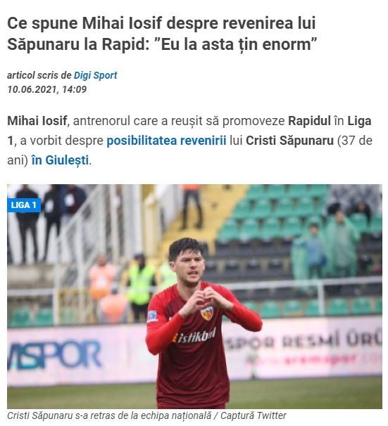 Rapid Bükreş'in Teknik Direktörü Mihai Iosif'a Sapunaru'nun Rapid'e dönüşü hakkında ne diyorsunuz sorusuna; Sapunaru'yu çok önemsiyorum" dedi.