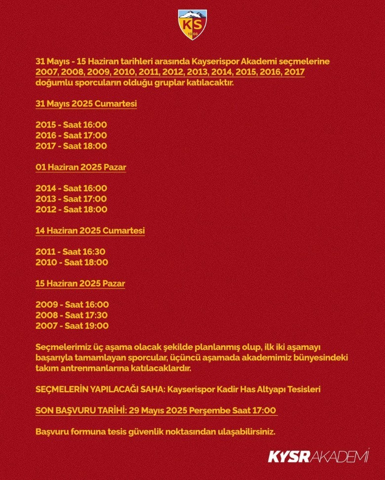 Kayserispor Futbol Akedemisi için seçmeler başılyor. Seçmelere müracat 29 Mayıs 2025 Perşembe 17:00 son tarih.