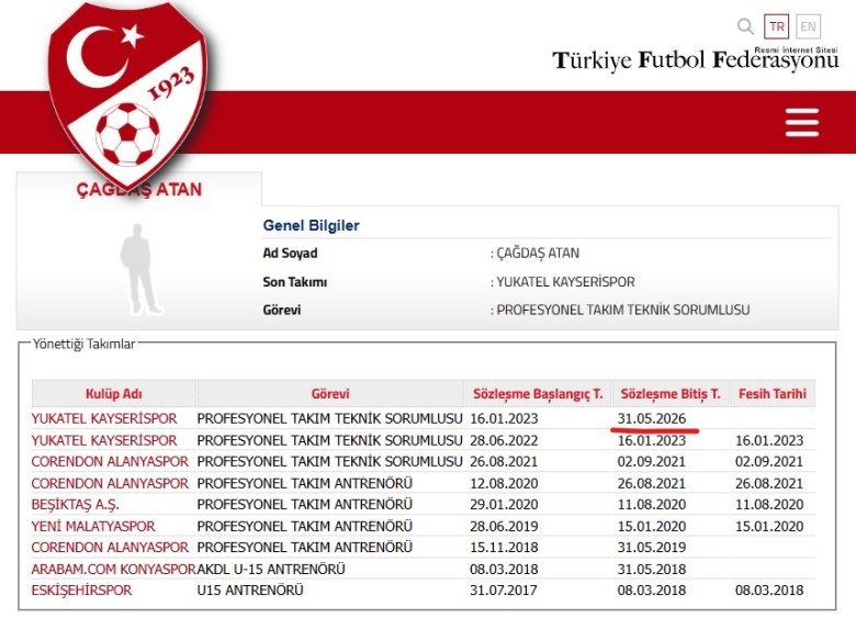 TFF kayıtlarında Kayserispor'un Çağdaş Atan ile sözleşmesi 16.01.2023 tarihinden geçerli olmak üzere 31.05.2026 tarihine kadar tescil edildiği görülmektedir.