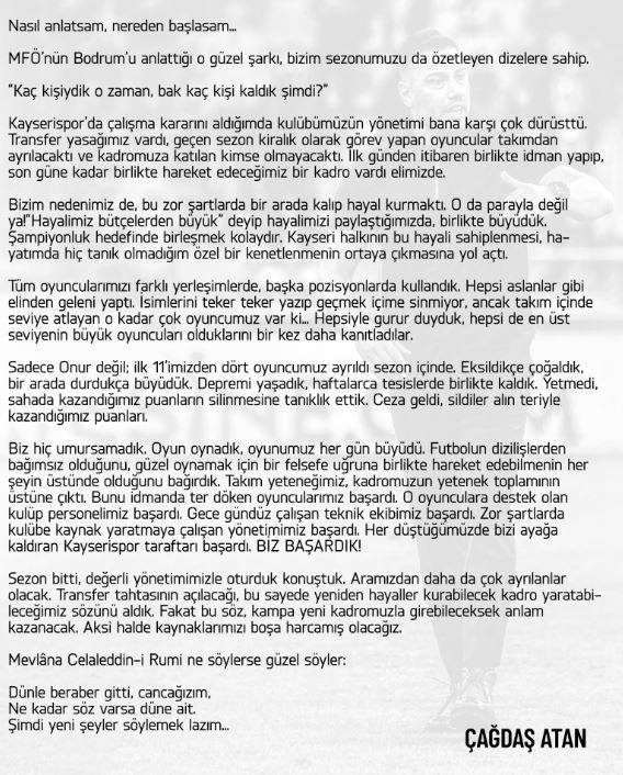 Kayserispor Teknik Direktörü Çağdaş Atan sosyal medra adresinden sezon sonu değerlendirmesi yaptı.