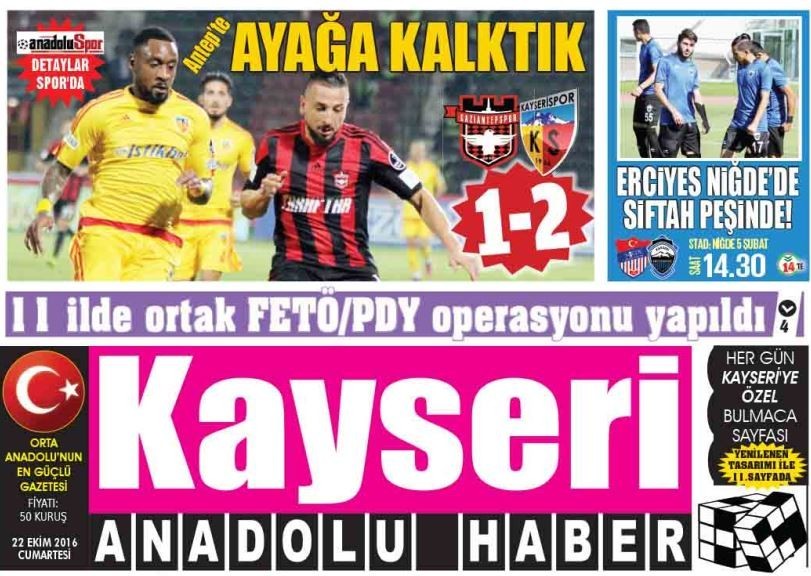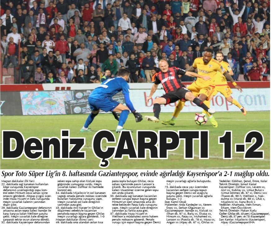 Kayserispor'un Gaziantepspor'u 2-1 yenmesi üzerine, Antep basınında maç maç sonucu çarpıcı başlıklarda duyuruldu.