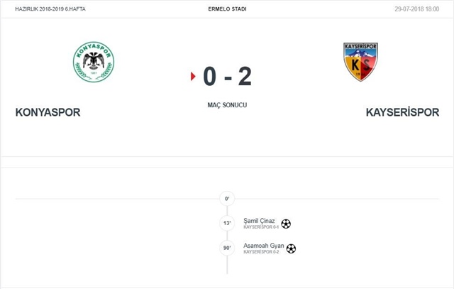 Kayserispor, Hollanda'da yaptığı hazırlık maçında Konyaspor'u 2-0 mağlup etti.Kayserispor'un gollerini 13.Dakikada Şamil Şinaz ve 90.Dakikada Asamoah Gyan attı.