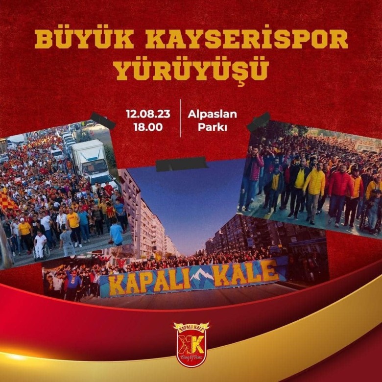 Kayserispor Taraftar Derneği Kapalı Kale 12 Ağustos Cumartesi günü saat 18:00 'da Alpaslan Parkından başlayan "BÜYÜK KAYSERİSPOR YÜRÜYÜŞÜ" gerçekleştirecek.