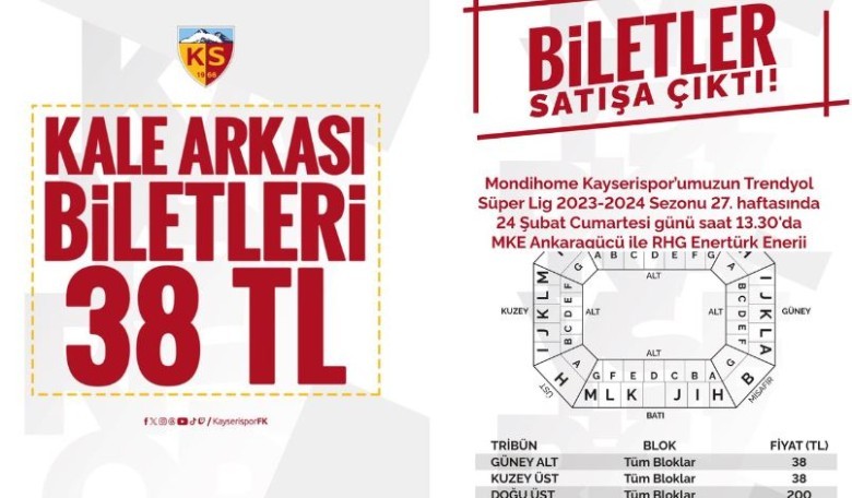 Kayserispor’un Süper Lig 2023-2024 Sezonu 27. haftasında 24 Şubat Cumartesi günü saat 13.30'da MKE Ankaragücü ile Kadir Has Stadında oynayacağı karşılaşmanın biletleri Passolig tarafından satışa sunuldu.