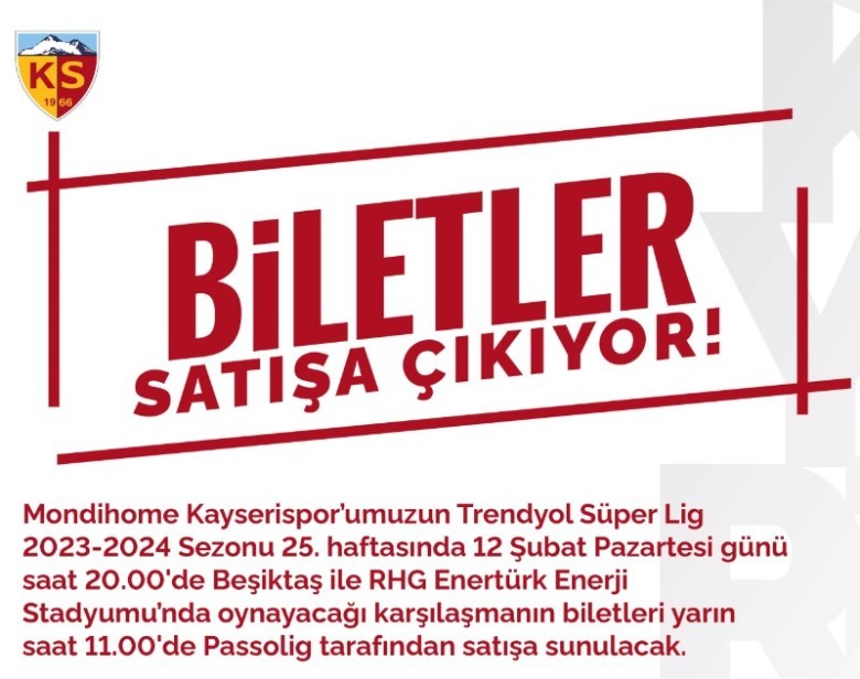 Kayserispor Süper Lig 2023-2024 Sezonu 25. haftasında 12 Şubat Pazartesi günü saat 20.00'de Beşiktaş ile Kadir Has Stadında oynayacağı karşılaşmanın biletleri Salı günü saat 11.00'de Passolig tarafından satışa sunulacak.