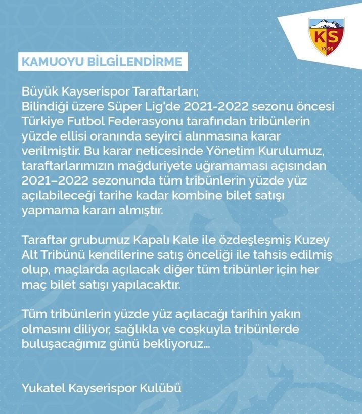 0 1 0 0 0 Genel Kayserispor'da Kombine Satışları Askıya Alındı. 4 yıl önce oluşturuldu. — 1 saniye önce güncellendi Kayserispor Yönetim Kurulu yapmış olduğu açıklamada; pandemi dolayısı ile 2021-2022 sezonunda stadyum kapasitelerinin %50 kısıtlamasından sonra, Kombine satışlarının 2.bir açıklamaya kadar yapılmayacağını duyurdu. Kombine Bu İçeriğe Tepki Ver (en fazla 3 tepki) 0 Beğendim 0 Beğenmedim Facebook Yorumları
