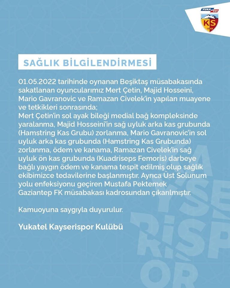 Kayserispor kulübünden yapılan açıklamada "1 Mayıs günü oynanan Beşiktaş maçında sakatlanan oyuncularımız Mert Çetin, Majid Hosseini, Mario Gavranovic ve Ramazan Civelek'in yapılan muayene ve tetkikleri sonrasında; Mert Çetin'in sol ayak bileği medial bağ kompleksinde yaralanma, Majid Hosseini'nin sağ uyluk arka kas grubunda zorlanma Mario Gavranovic'in sol uyluk arka kas grubunda zorlanma, ödem ve kanama, Ramazan Civelek'in sağ uyluk ön kas grubunda darbeye bağı yaygın ödem ve kanama tespit edilmiş olup sağlık ekibimizce tedavilerine başlanmıştır. Ayrıca üst sonunum yolu enfeksiyonu geçiren Mustafa Pektemek, Gaziantep müsabakası kadrosundan çıkarılmıştır. Kamuoyuna saygıyla duyurulur" denildi.