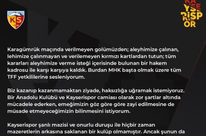 Kayserispor şanlı mazisi ve onurlu duruşu ile hiçbir zaman mazeretlerin arkasına saklanan bir kulüp olmamıştır. Ancak şunun da altını çizmek istiyorum ki; hiçbir zulme ve çirkinliğe, şanlı tarihi boyunca boyun eğmemiştir ve sonucu ne olursa olsun eğmeyecektir.