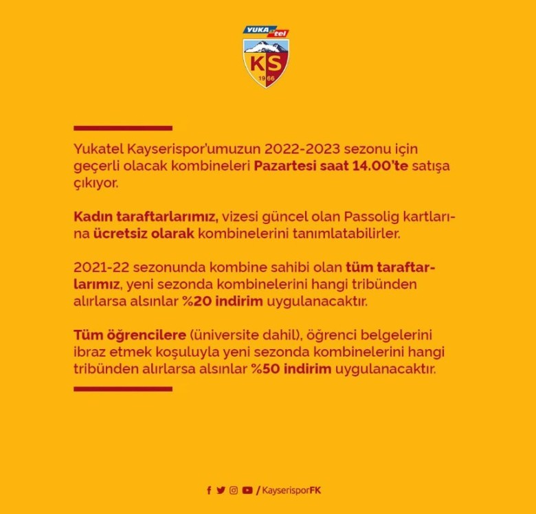 📣 Yukatel Kayserispor’umuzun 2022-2023 sezonu için geçerli olacak kombineleri pazartesi saat 14.00’te satışa çıkıyor.