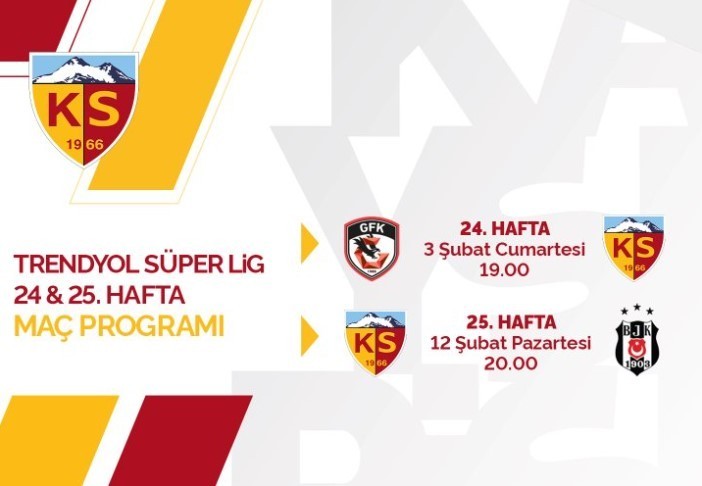 Kayserispor'un 24.Hafta Gaziantep FK maçı 3 Şubat Cumartesi 19:00'da 25.Hafta Beşiktaş maçı ise 12 Şubat Pazartesi oynananacak.