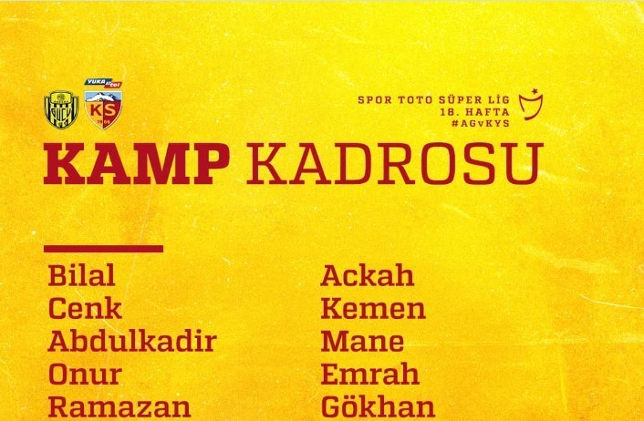 Kayserispor'un Pazar günü 16.00 'da Ankaragücü ile deplasmanda oynayacağı maçın kamp kadrosu belli oldu. Kamp kadrosunda 21 futbolcu yer aldı.