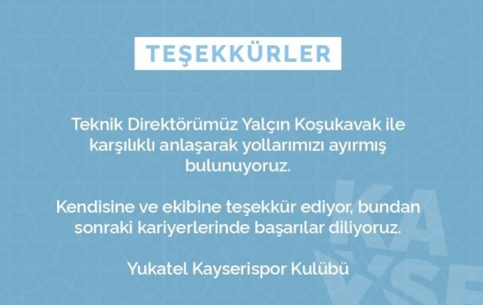 Kayserispor'da Altay Maçı Sonrası alınan ağır mağlubiyet sonrası yollarını ayırmıştı. Resmen ayrılığı bugüne kadar duyurulmamıştı. Bugün Yalçın Koşukavak ile resmen ayrıldığını bir "Teşekkür" mesajı ile kamuoyuna duyurdu.