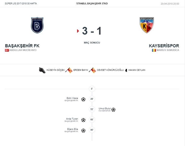 ⚽GOLLER ⚽ 28 Dk. Edin Visca (BAŞAKŞEHİR FK )’ ⚽ 53 Dk. Umut Bulut (KAYSERİSPOR )’ ⚽ 66 Dk. Arda Turan (BAŞAKŞEHİR FK )’ ⚽ 90 Dk. Eljero Elia (BAŞAKŞEHİR FK )’
