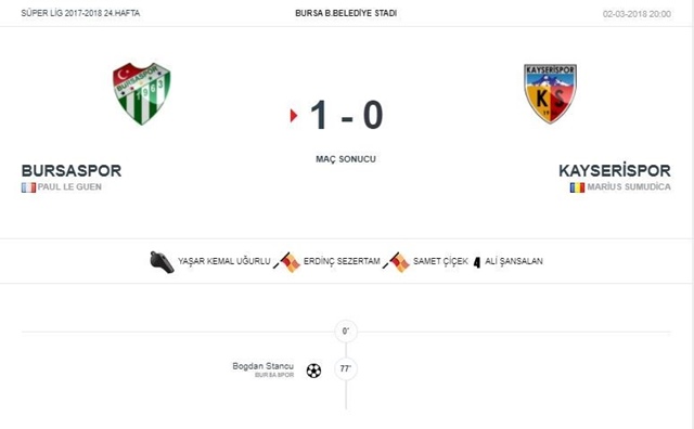 🔃 67 Dk. John Bostock (BURSASPOR) 🔃 67 Dk. Moussa Sow (BURSASPOR) 🔃 76 Dk. Yusuf Erdoğan (BURSASPOR) 🔃 76 Dk. Georghe Grozav (BURSASPOR) 🔃 89 Dk. Jires Kembo Ekoko (BURSASPOR) 🔃 89 Dk. Mikel Agu (BURSASPOR)