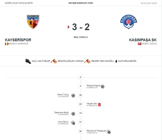 ⚽GOLLER ⚽ 2 Dk. Mbaye Diagne (KASIMPAŞA SK )’ ⚽ 20 Dk. Deniz Türüç (KAYSERİSPOR )’ ⚽ 74 Dk. Stephane Badji (KAYSERİSPOR )’ ⚽ 77 Dk. Umut Bulut (KAYSERİSPOR )’ ⚽ 92 Dk. Mahmoud Trezeguet (KASIMPAŞA SK )’