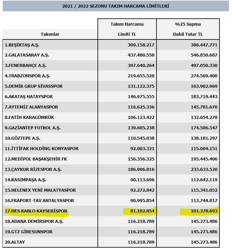 9 Haziran 2021 tarihinde yürürlüğe giren Kulüp Lisans ve Finansal Fair Play Talimatı'nın 89. Maddesi kapsamında, Ek XII'de yer alan usullerle belirlenen Süper Lig Takım Harcama Limitleri şu şekilde hesaplandı: