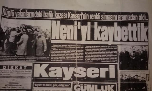 Kayseri tarihinde sosyal hayat deyince ilk akla gelen isim olan Neni, yine bir organizasyon için koştururken, geçirdiği bir trafik kazası sonucu, 52 yaşında, hayatının en verimli çağında hayatını kaybetmiş...